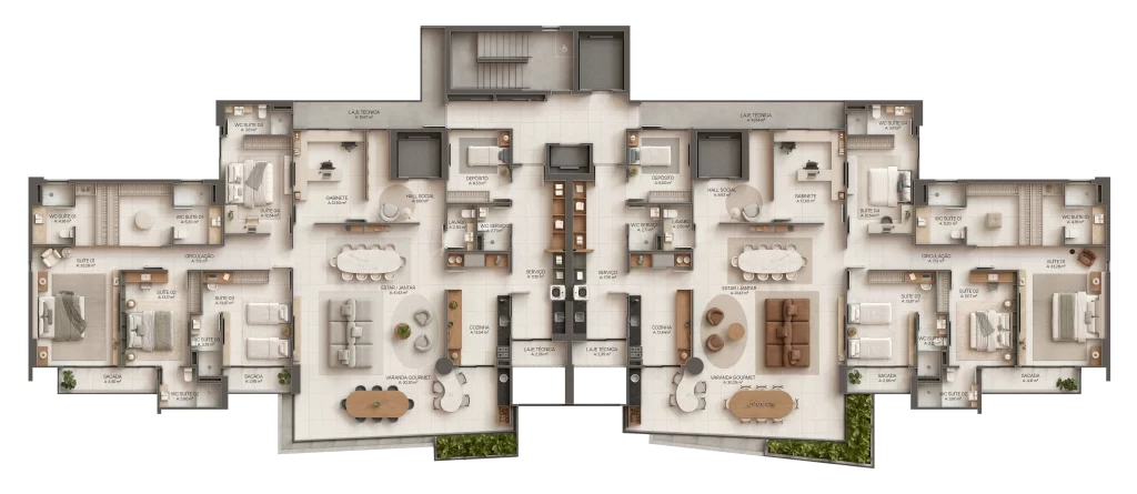 A tipologia contempla os seguintes espaços por planta: living para estar e jantar com varanda, escritório, sala íntima, 4 suítes plenas e com closet. Os apartamentos devem ter 4 vagas de garagem cada.